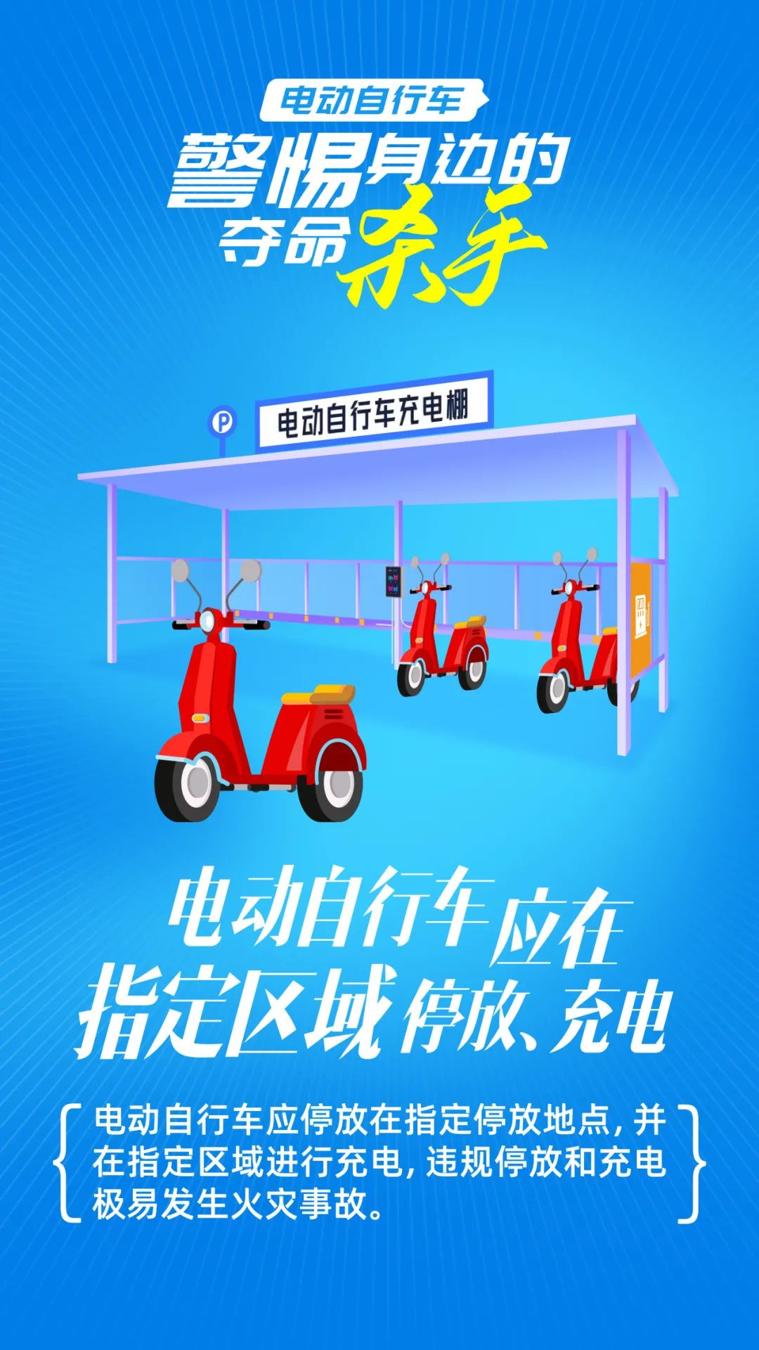 6.严禁在易燃品附近充电。 电动车充电要远离易燃可燃材料搭建的电动自行车停放场所和易燃易爆物品。