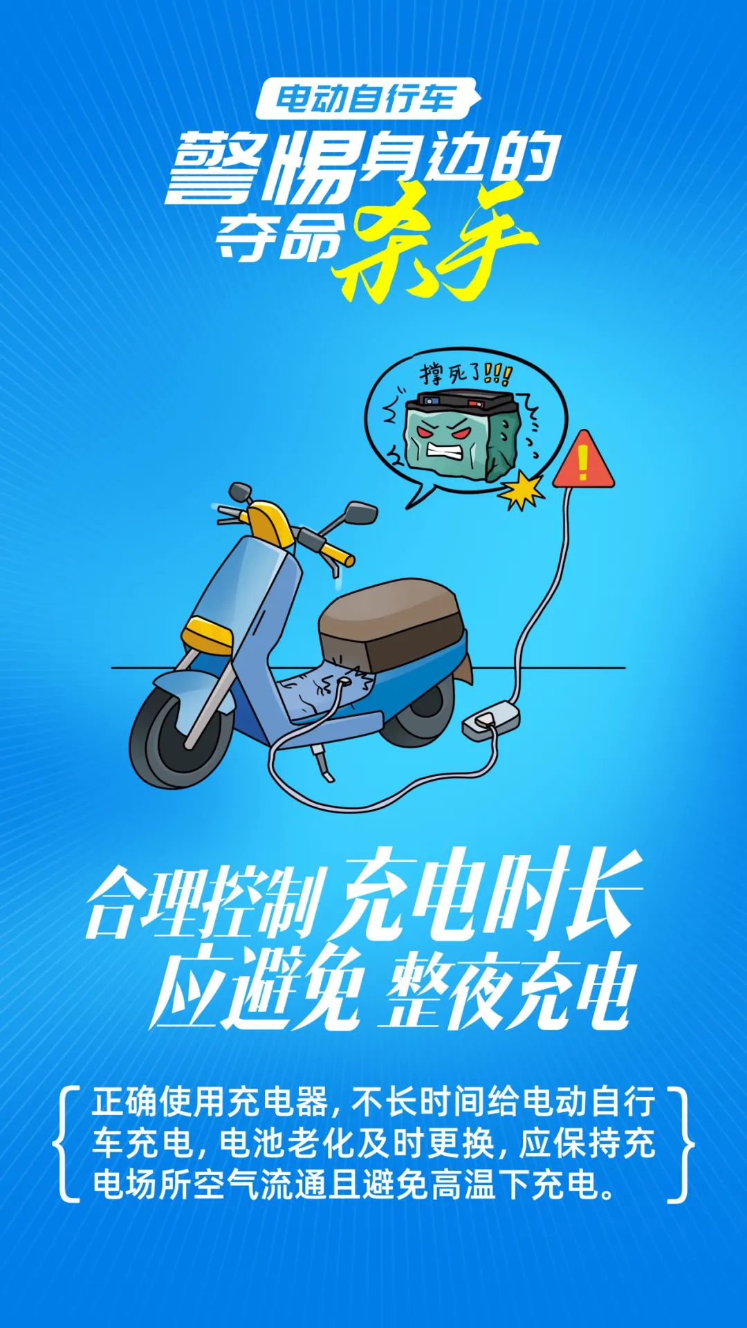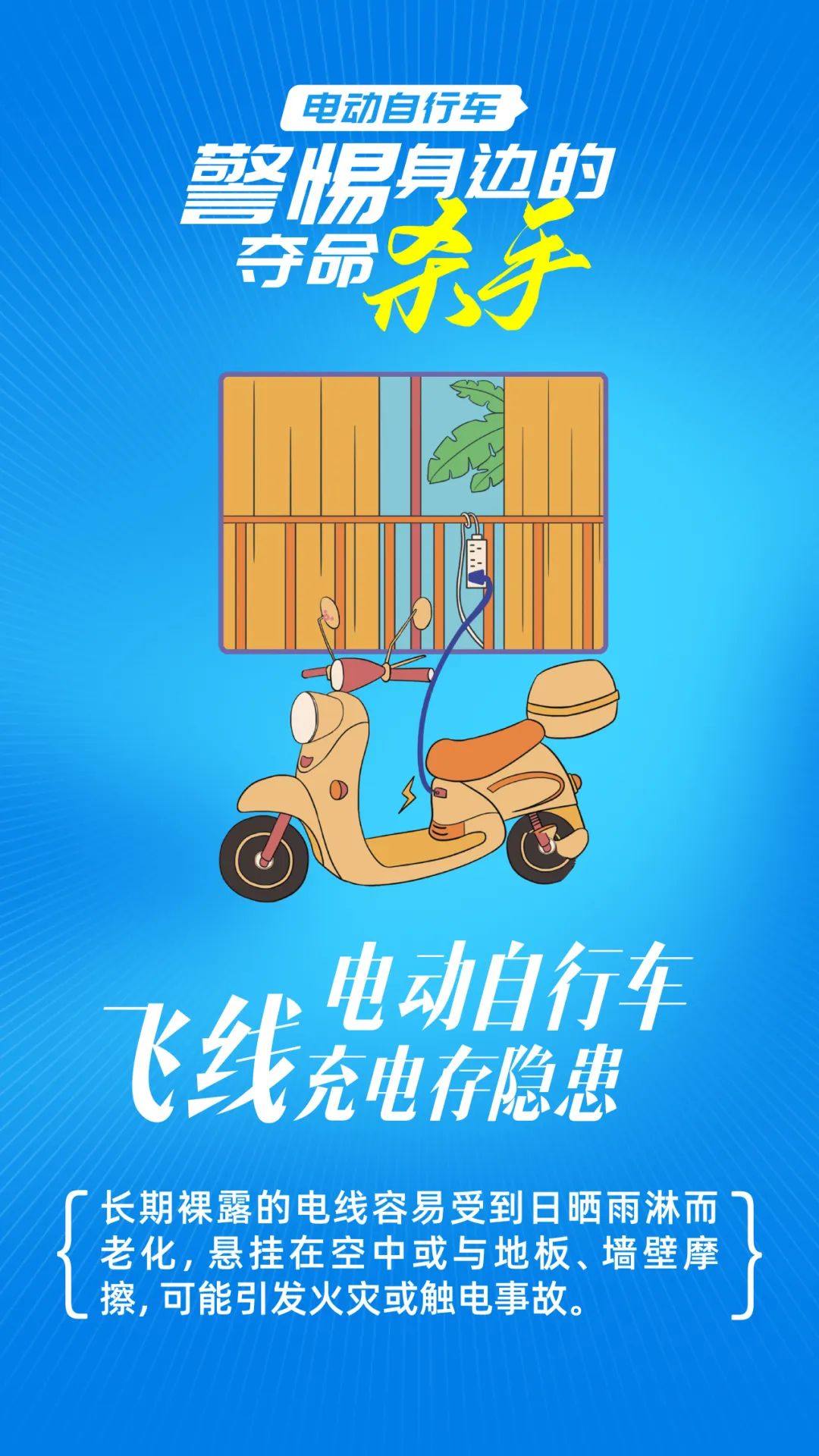 5.严禁“飞线充电”。 严禁采用私拉电线、乱装插座等不符合消防技术标准和管理规定的方式为电动自行车充电。