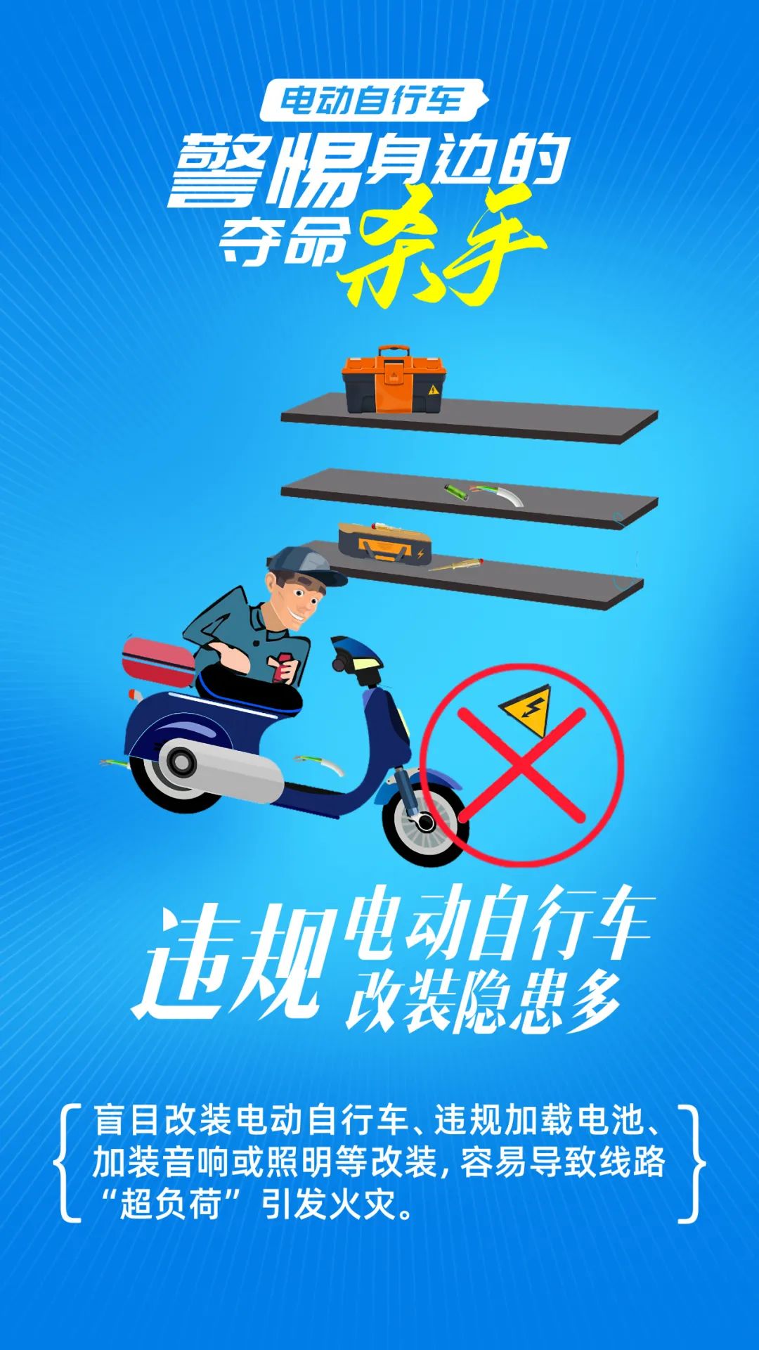 2.严禁擅自改装。 擅自改装电池、加装音响、照明等,容易造成线路超负荷引发火灾,擅自解除电动车限速会导致交通事故风险增加。